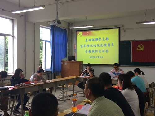 2017年7月5日上午9点,基础课部党支部在二号教学楼3楼3-4教室组织召开巡视反馈意见整改落实组织生活会,会议由党支部书记许庆兵同志主持。
