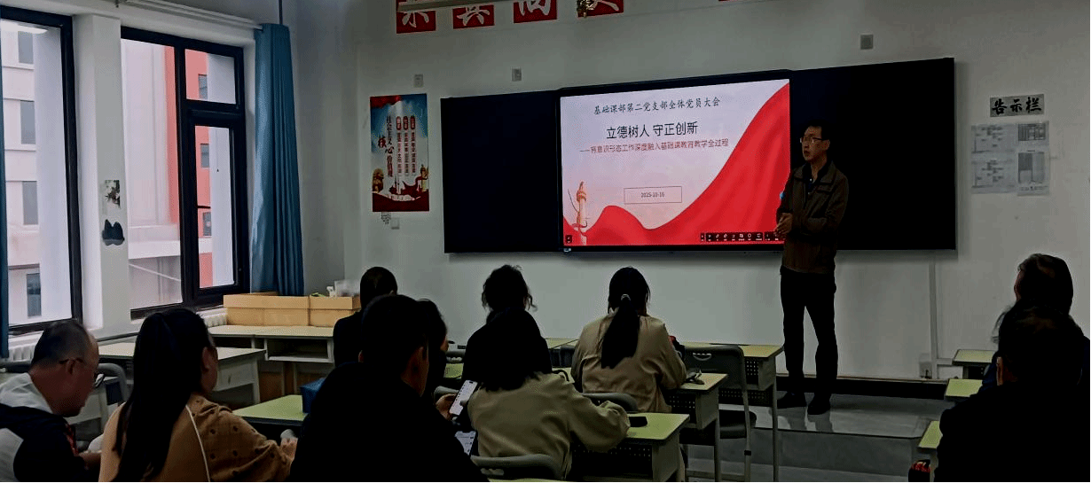 2025年10月16日中午,基础课部第二党支部在4#203教室召开第四季度全体党员大会,围绕主题“立德树人 守正创新——将意识形态工作深度融入基础课教育教学全过程”,开展深入研讨并部署相关工作。会议由支部书记主持,全体党员参会。